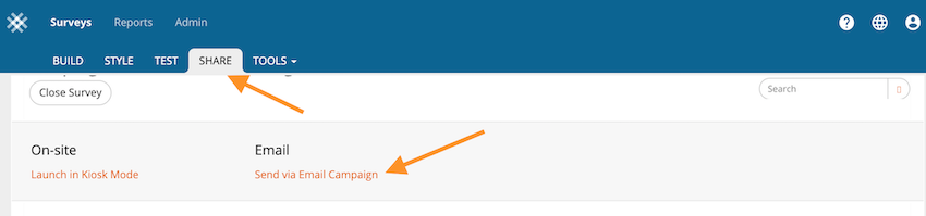 Once you have created your first survey and are ready to deploy to staff, click the Share tab, then scroll down to Send Via Email Campaign.