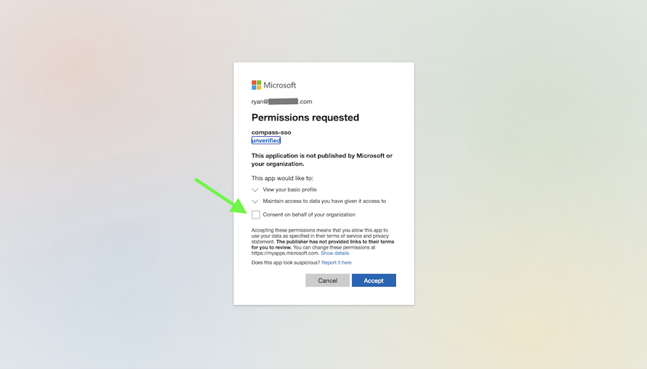 Now new users to Compass will not have to accept the Microsoft permission request.