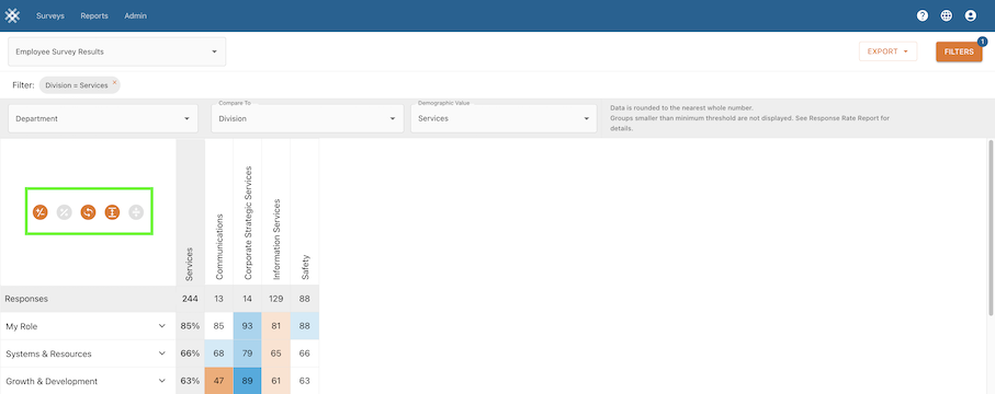 1. Click the percentage icon to view the percent favourable score instead of the delta value. Click the **swap axis** icon to show demographic groups along the Y axis.