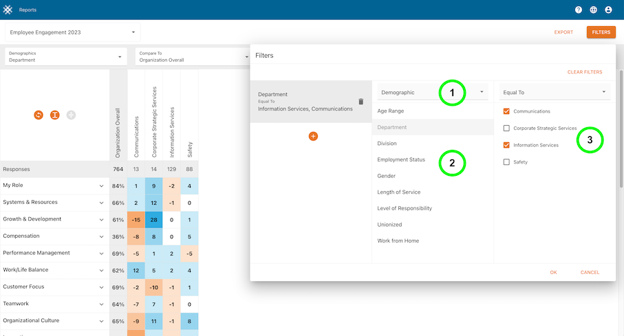 1. Click **Filters** in the top right corner. Available data will be displayed in the center column where you can choose between Demographic, Survey Item and Date. Once a field is selected, you will see the available filter options in the right column. Check the boxes for data you would like to filter, then click **OK**.<br>