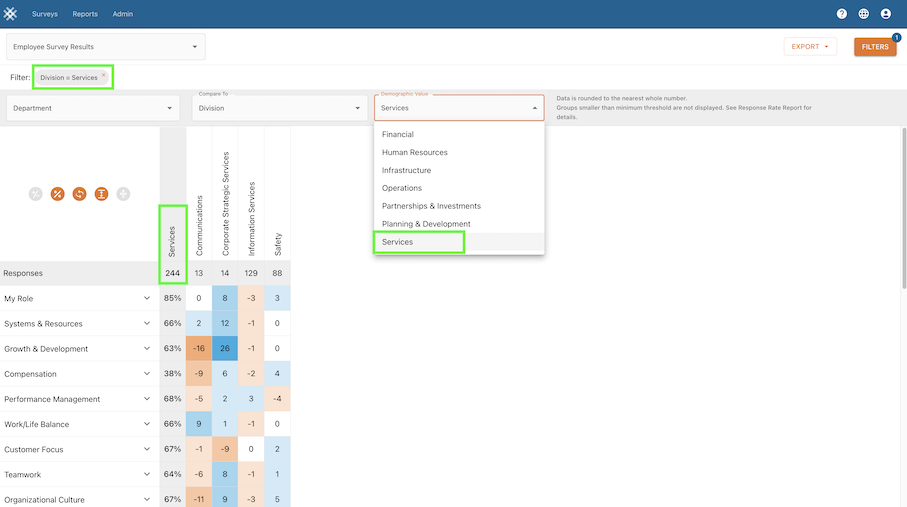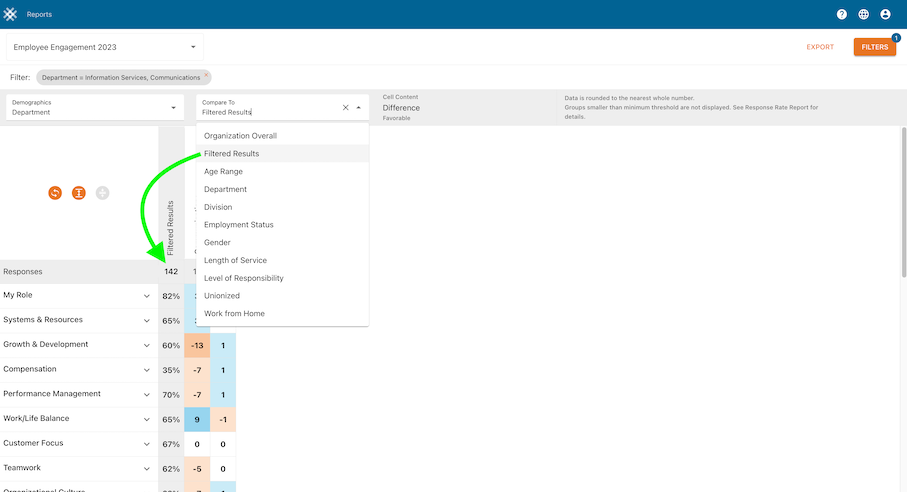 A heatmap report creates a visual comparison across the entire organization based on demographic groups. It shows you the highs and lows in overall results at a glance.