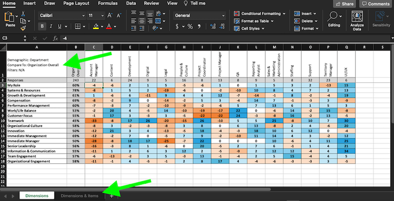 2. When viewing the Heatmap in Excel, you can view only Dimension scores or click on the second sheet at the bottom of the file to view Dimension and Item scores.